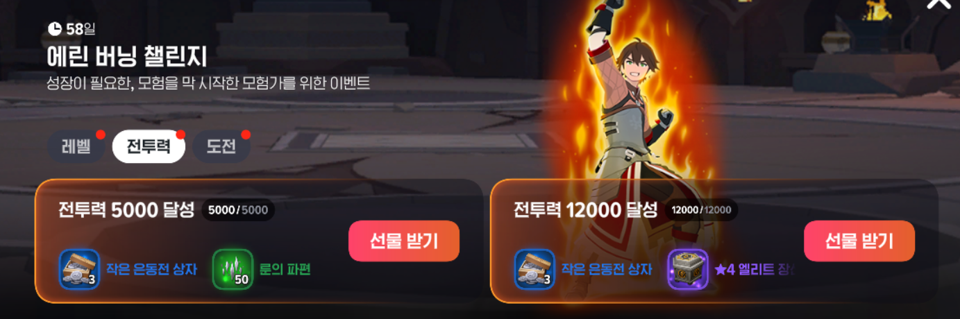 | 전투력 | 전투력 5000 달성 | 작은 은동전 상자 / 룬의 파편 | 3개 / 50개 |