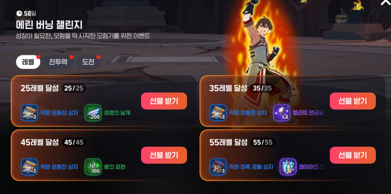 - 참여 방법: 우측 상단 [메뉴(≡)] → [이벤트] → [에린 버닝 챌린지] 탭에서 확인 및 선물 수령이 가능합니다.