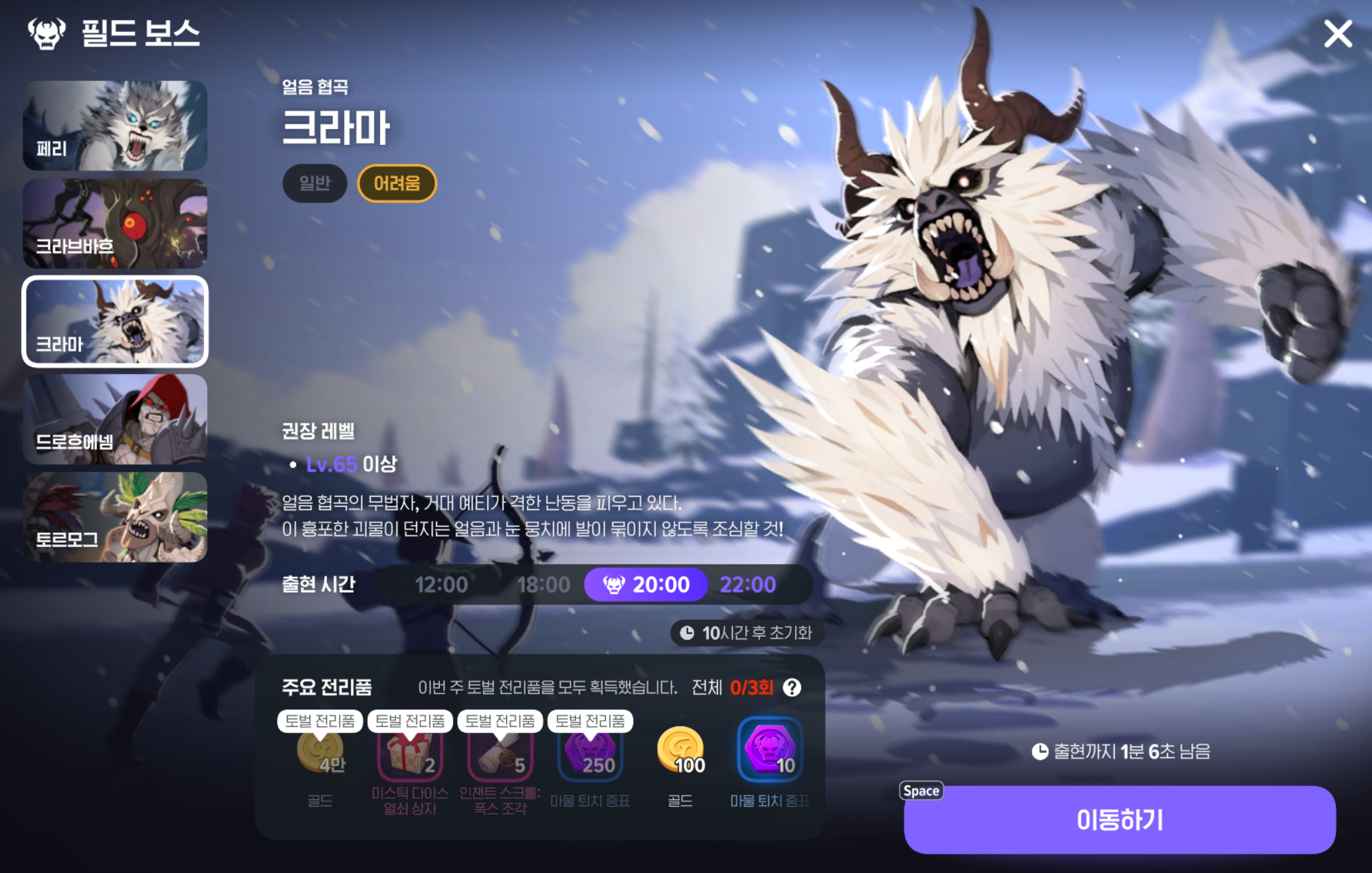 - 얼음 협곡 7구역 방문: 크라마를 처치한 후 필드 보스 구역에서 나오세요.