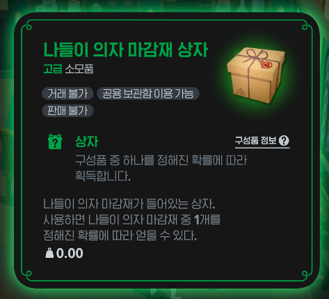 럭키 찬스 답례품은 이름 그대로 대박 보상이 가득합니다. 특히 우리의 목표인 '나들이 의자 마감재 상자'가 확정적으로 지급된다는 점이 가장 매력적이죠!