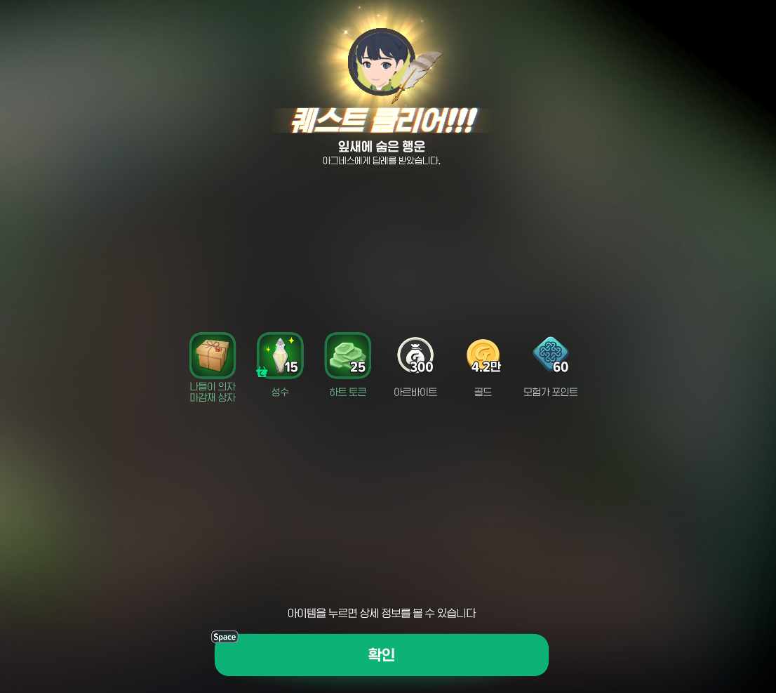 - 재화/재료 보상: 성수, 골드, 하트 토큰 등 풍성한 재료와 재화를 얻을 수 있습니다. 특히 하트 토큰 25개는 정말 혜자로운 보상이죠.