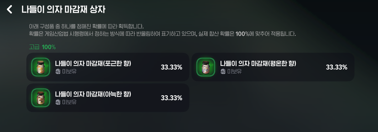 성수 15개, 골드 42,000개, 하트 토큰 25개도 좋지만! 역시 핵심은 나들이 의자 마감재 상자 아니겠어요? 이 상자를 열면 '포근한 향', '평온한 향', '아늑한 향' 마감재 3종 중 1종을 정해진 확률에 따라 얻을 수 있습니다. 저는 아쉽게도 이번엔 중복이 나왔지만, 언젠가는 원하는 마감재를 얻을 수 있다는 희망이 생겼어요! 매일매일 도전하는 재미가 쏠쏠합니다! 😉