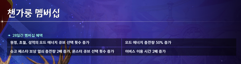 - 성장 가속: 원정, 초월, 성역의 큐브 선택 횟수도 2배로 늘어나니, 필수 구독 상품이라 할 수 있습니다.