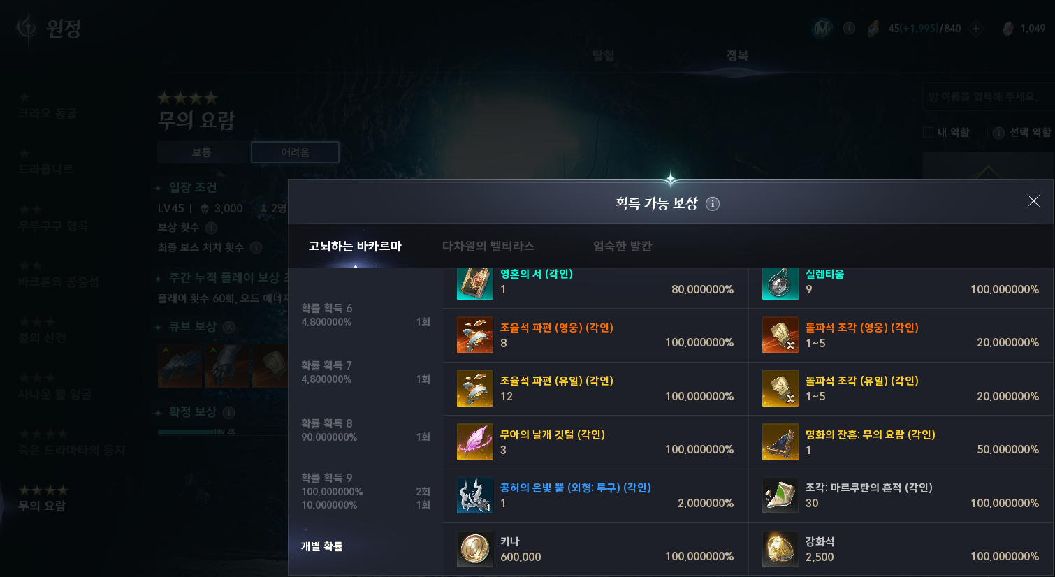 레벨 45부터는 특정 능력치에 특화된 상급 보드가 열리며, 각 보드에 맞는 '데바니온 결정'이 필요합니다. 주요 획득처는 다음과 같습니다.