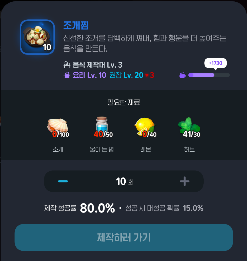 - 이 상태를 반복하면 조개찜 10개당 50개 물병 루프 유지 가능!