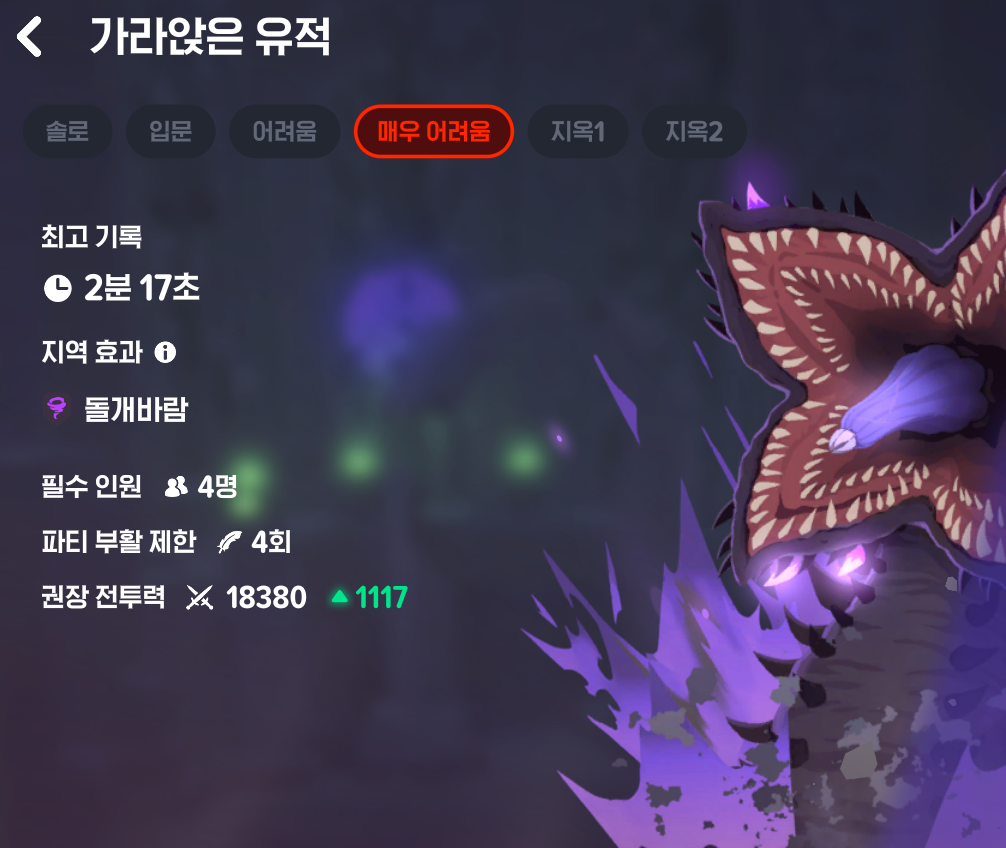 입장 전 자신의 전투력이 해당 난이도에 적합한지 꼭 확인하고 진입해야 합니다.