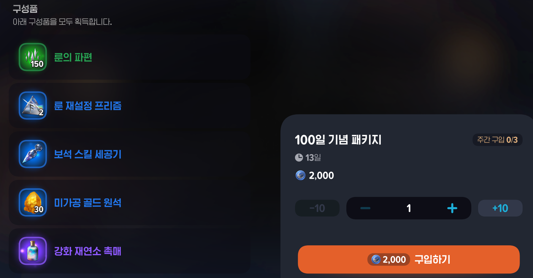 | 100일 기념 패키지 | 룬의 파편 | 150개 | 2,000 데카 | 캐릭터당 주 3회 |