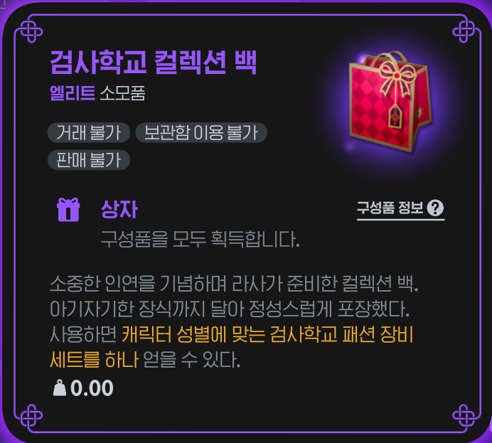 ‘검사학교 컬렉션 백’을 개봉하면, 아래의 모든 아이템이 지급됩니다!
