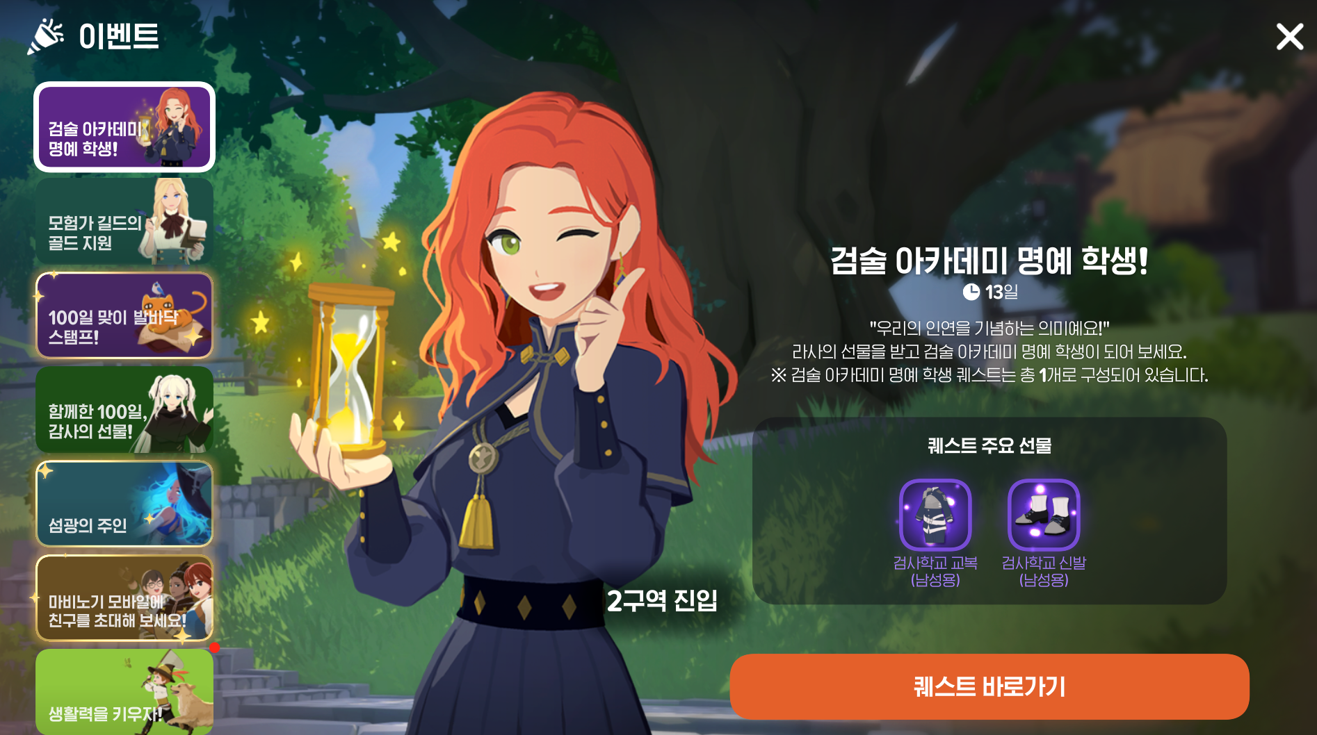- 참여 위치: 우측 상단 [≡ 메뉴] → [이벤트] → [검술 아카데미 명예 학생!]